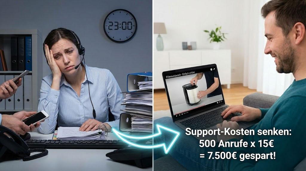 Die Rechnung ist simpel: Wenn ein Video für 5.000 € (das die Filter-Installation zeigt) nur 500 Anrufe im Jahr verhindert (à 15 € Kosten), haben Sie im ersten Jahr 7.500 € gespart. Der ROI ist sofort positiv. Und noch wichtiger: Der Kunde ist glücklicher. Niemand will in einer Hotline hängen. Wir wollen das Problem jetzt lösen, nachts um 23 Uhr, ohne Warteschleife.