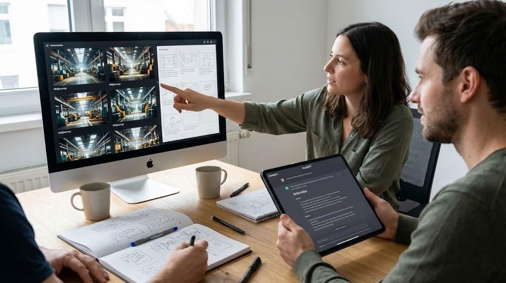 - Storyboard-Visualisierung: Früher mussten wir Zeichner bezahlen, um Skizzen für den Dreh zu machen. Heute generiert Midjourney in Minuten stimmungsvolle Bilder ("Moods"), damit Sie sich vorstellen können, wie die Lichtstimmung in der Fabrikhalle aussehen soll.