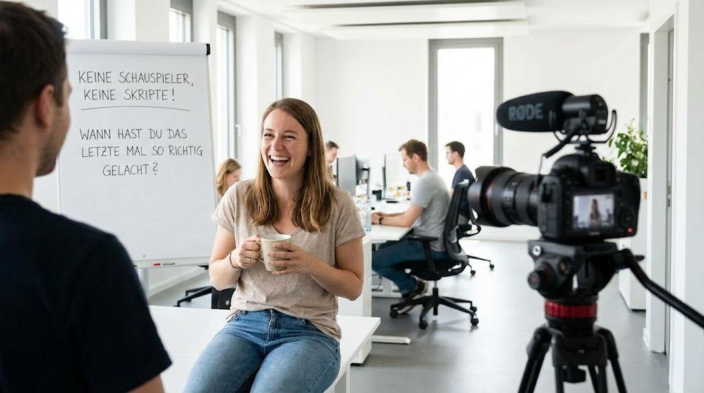 - Kein Skript: Lassen Sie Mitarbeiter frei sprechen. Die kleinen Versprecher und das echte Lachen sind das, was Vertrauen schafft.